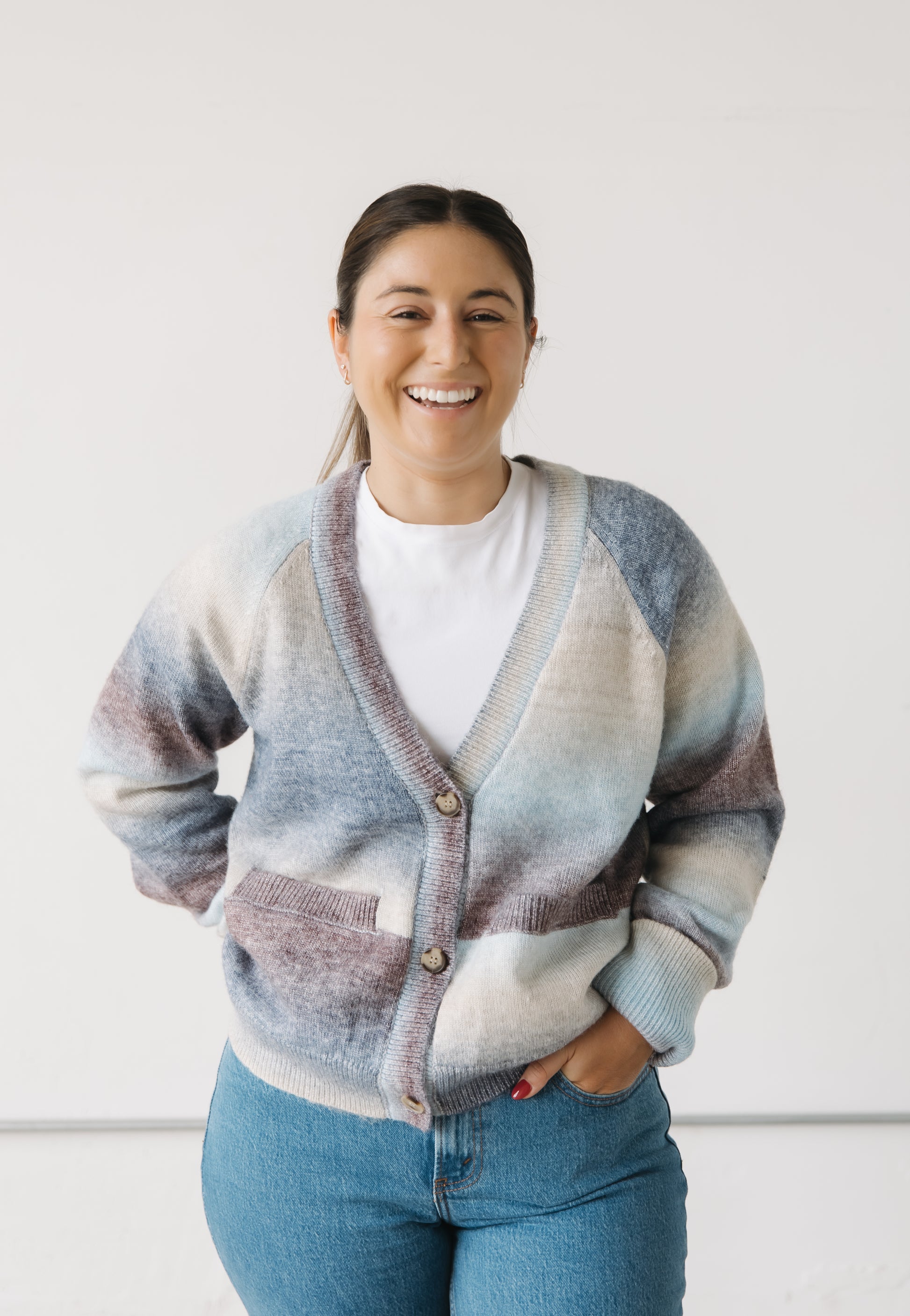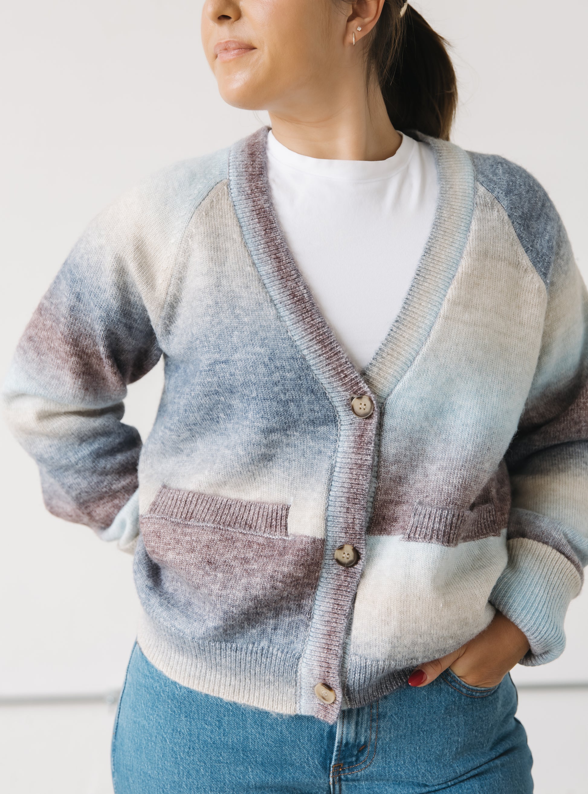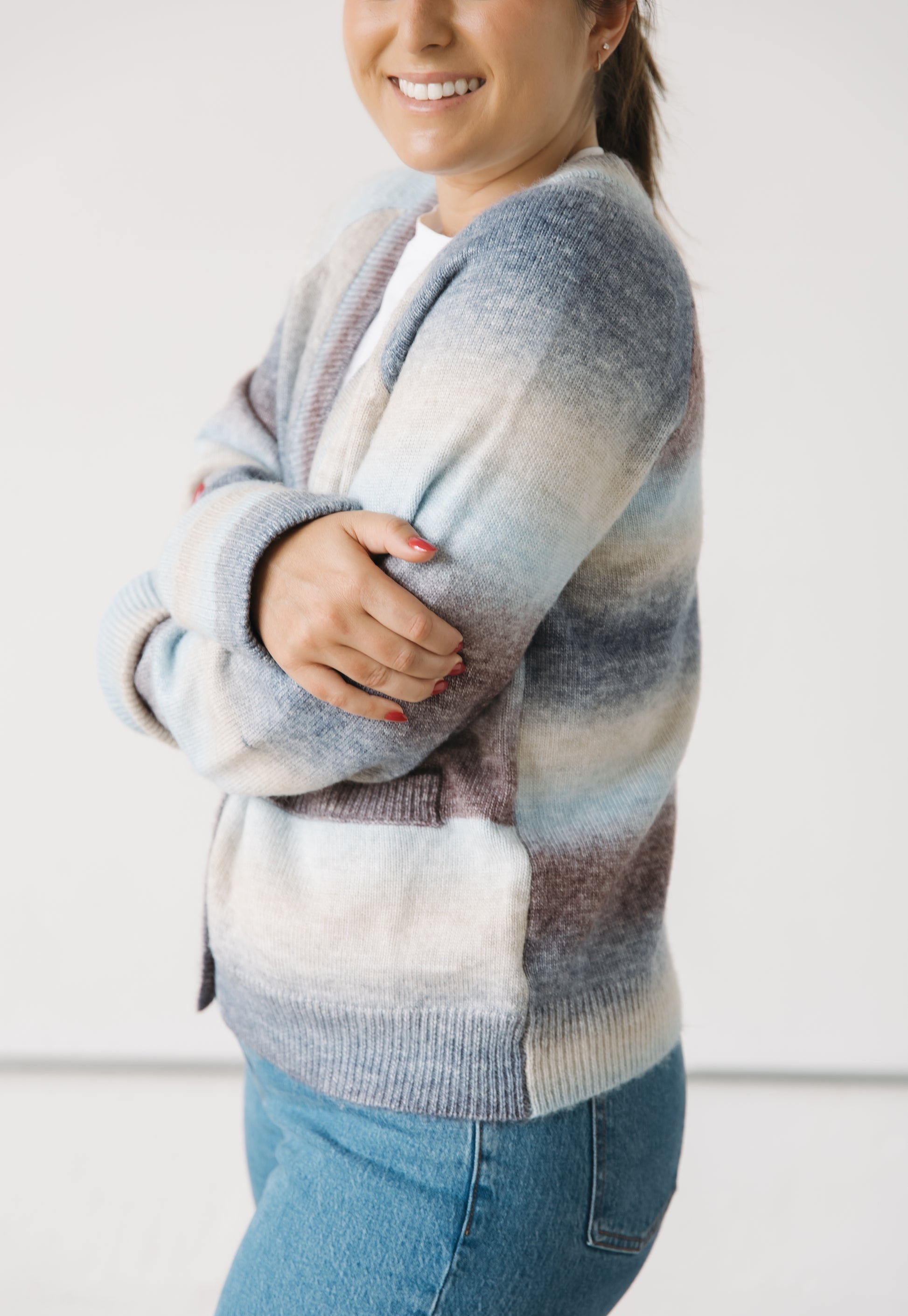 Get cozy in the Brigette Cardigan! This multicolored cardigan features soft blues, plum, and silver, perfect for fall weather. Stay stylish while staying warm.