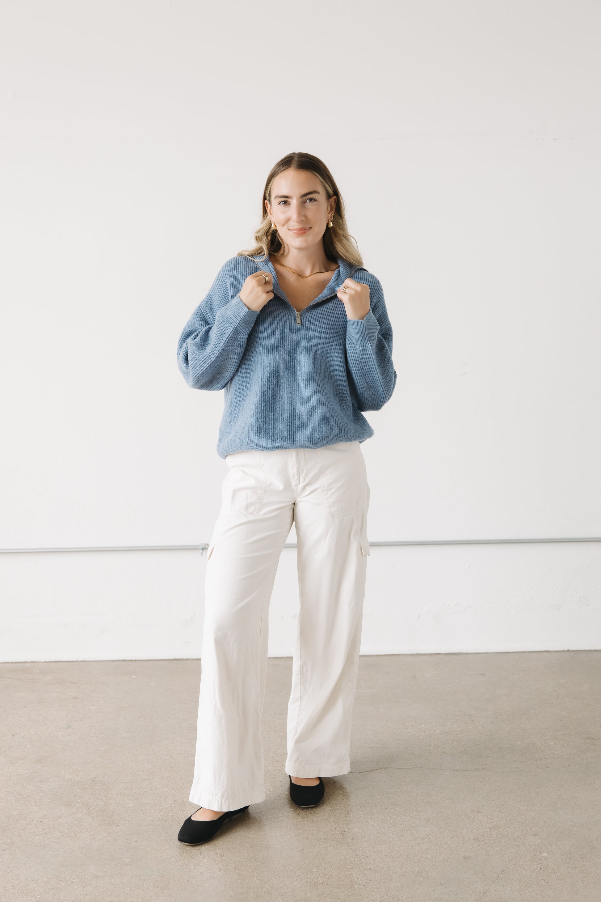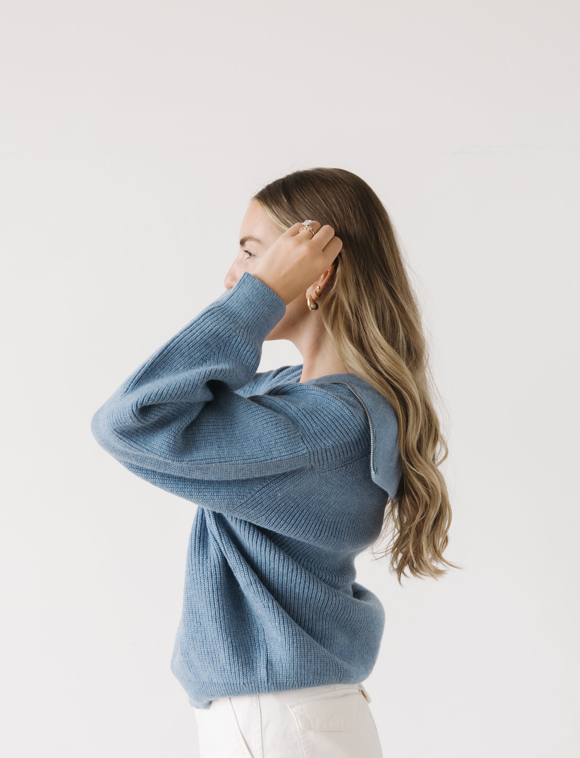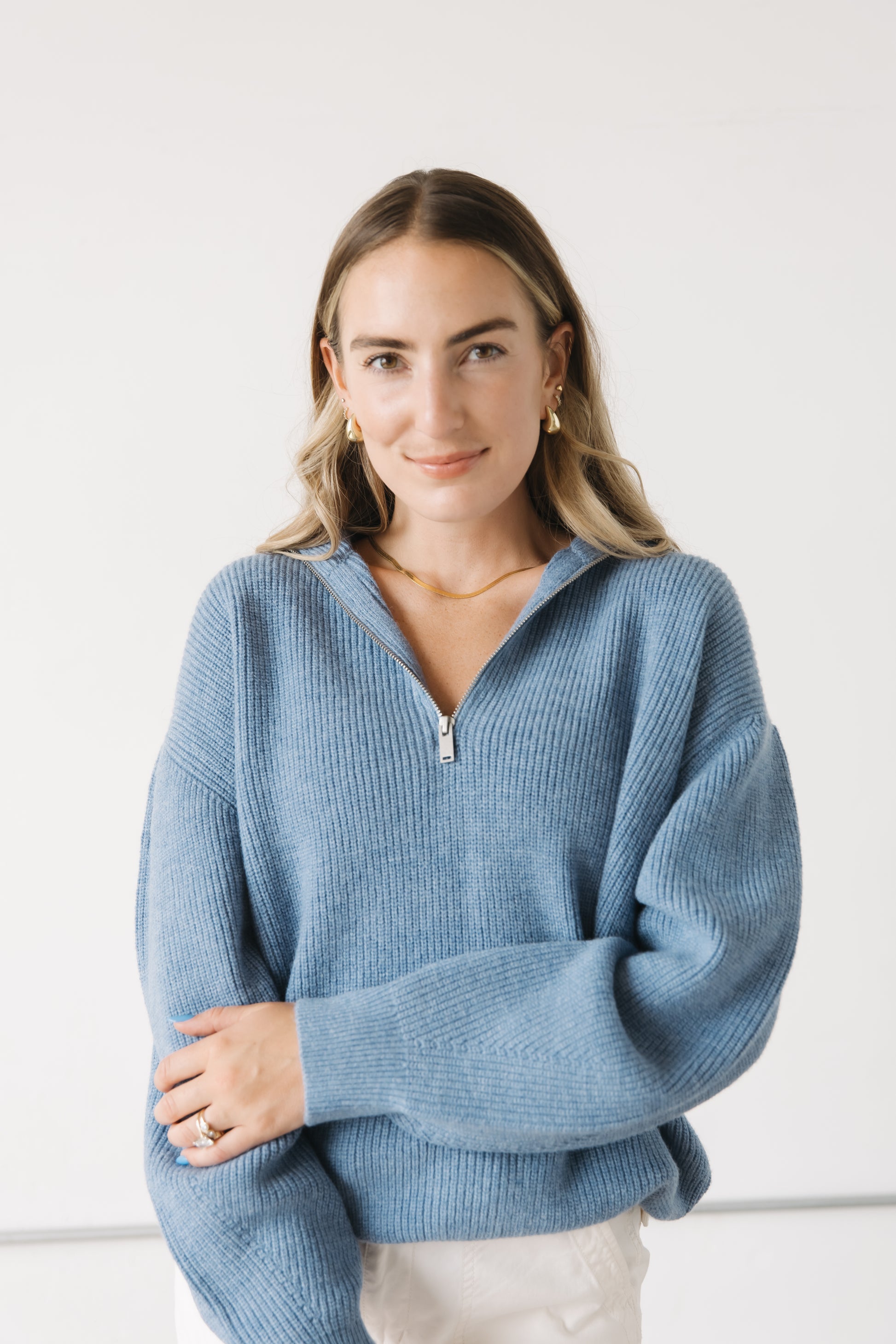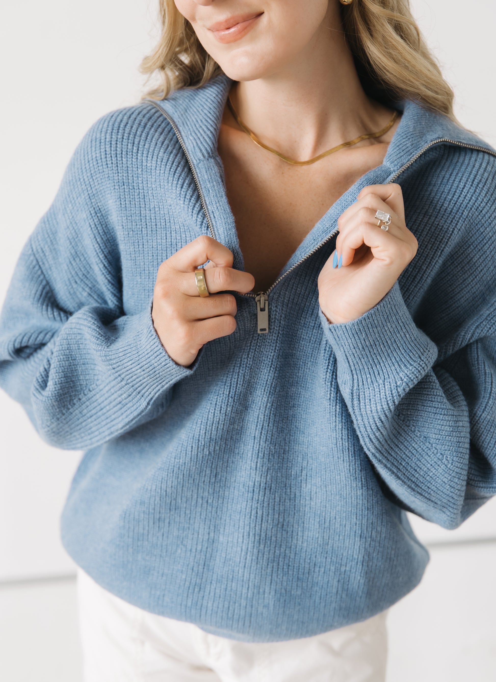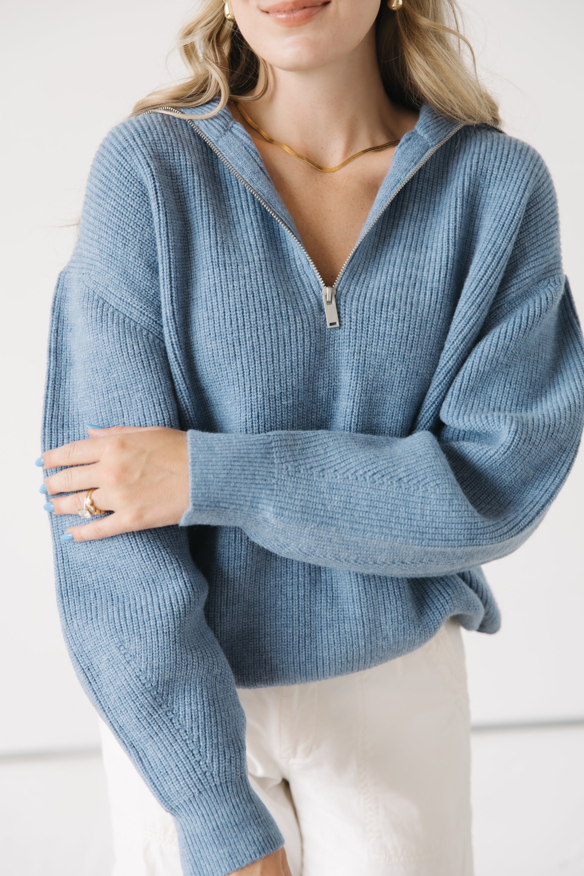 Stay cozy and stylish this fall in our Campbell Sweater. Made with a knit design and quarter zip, it's perfect for chilly days. The fold-over collar adds a touch of sophistication, while the denim blue color adds a pop of color to your wardrobe.