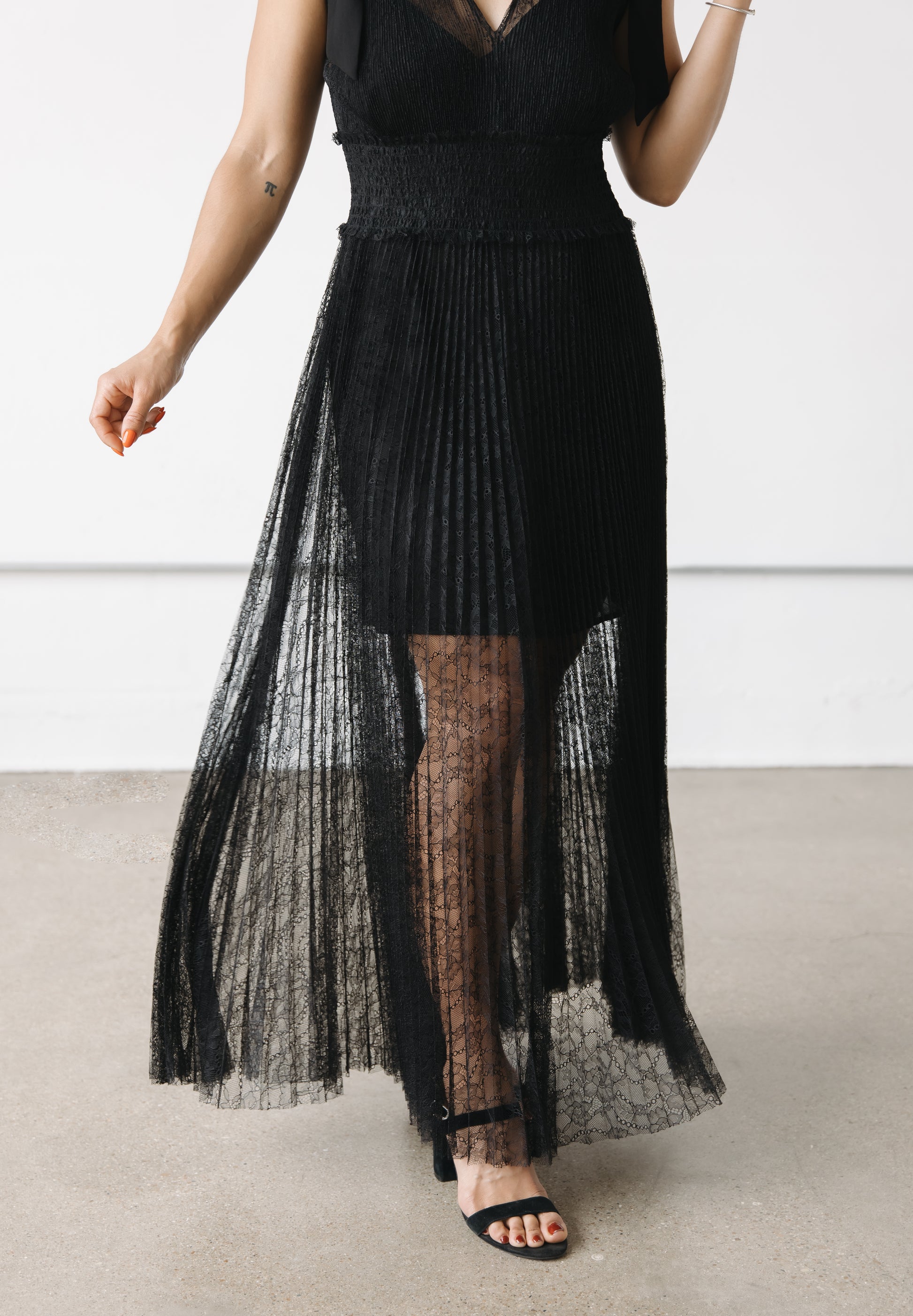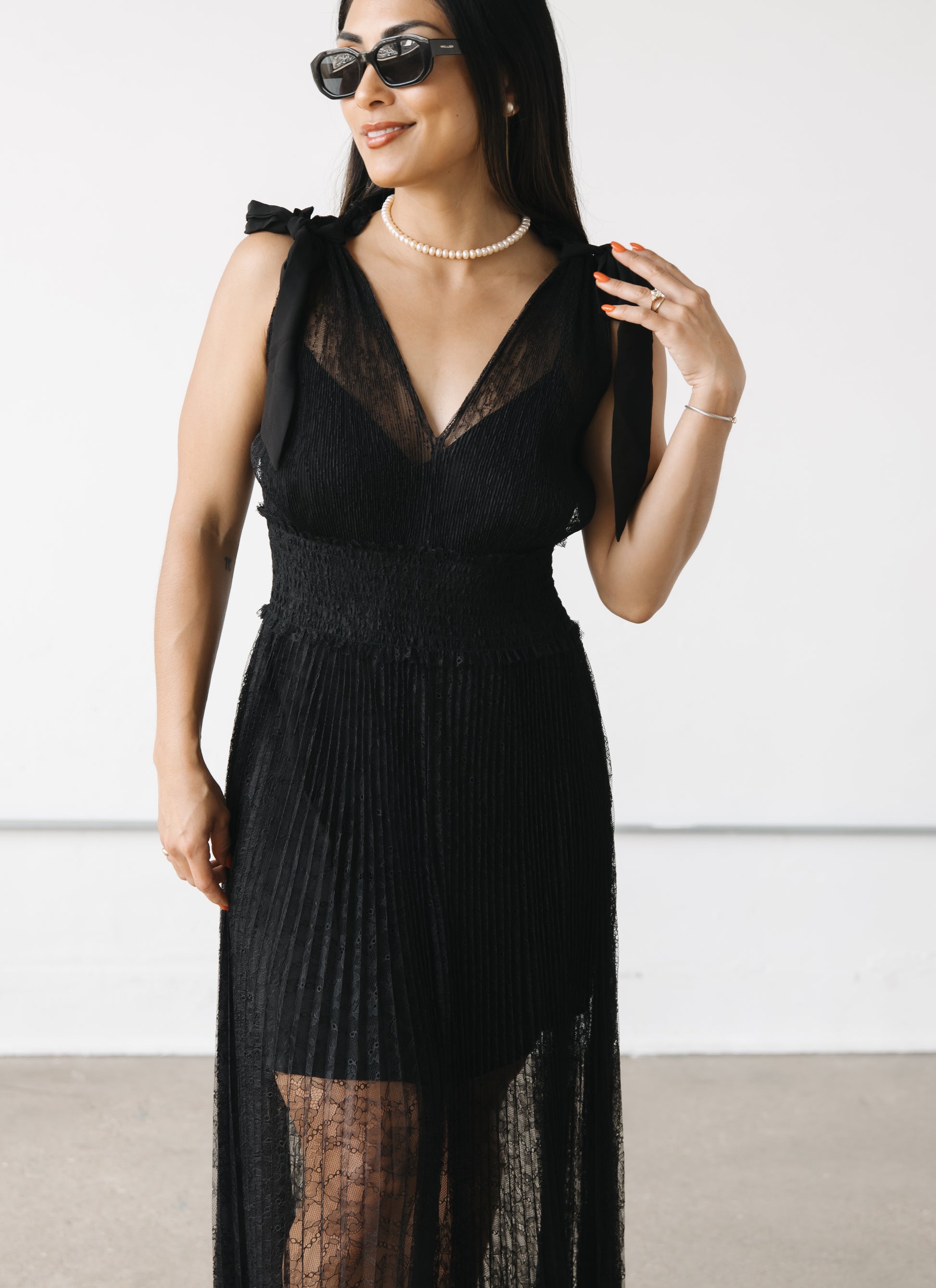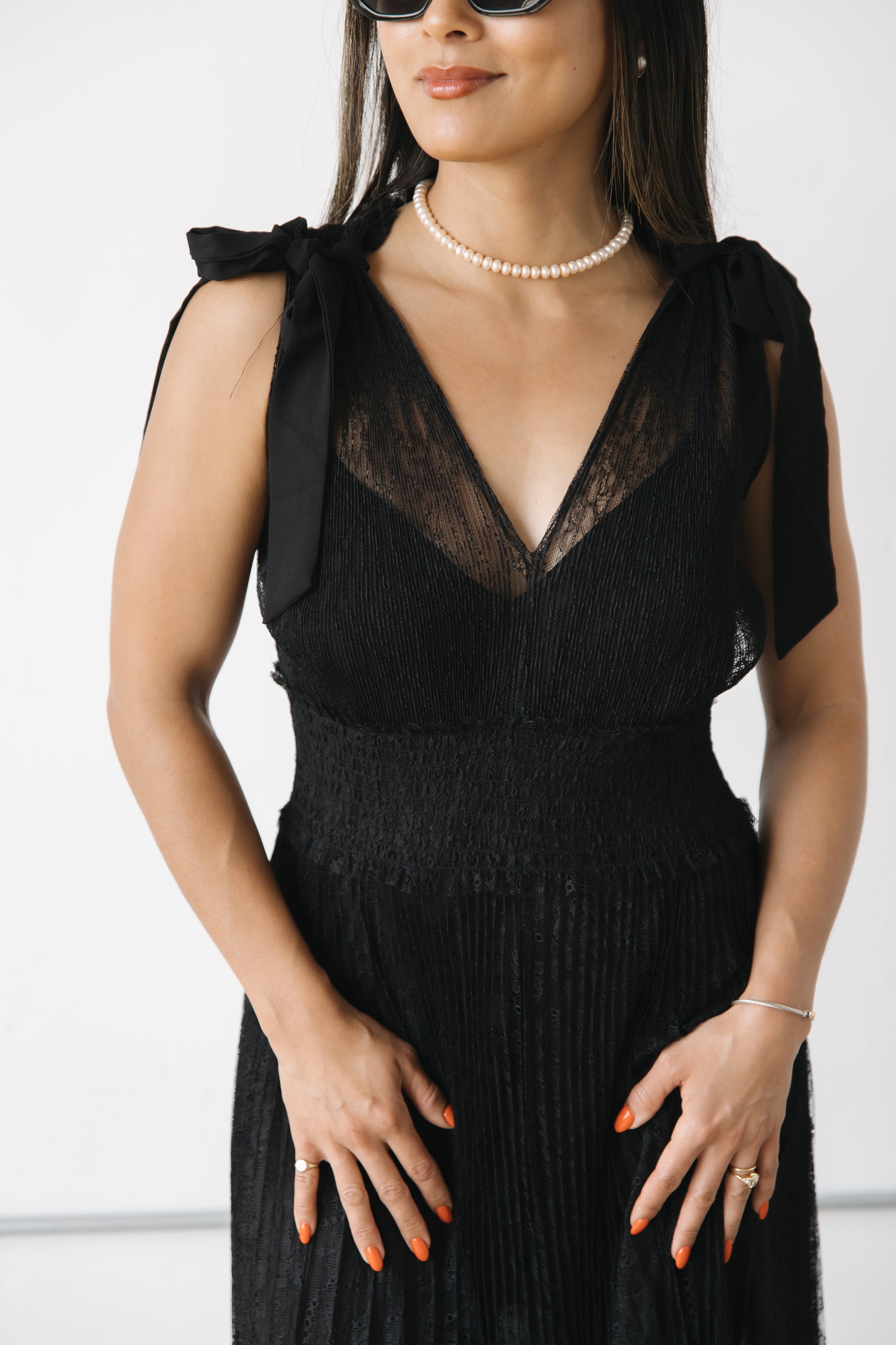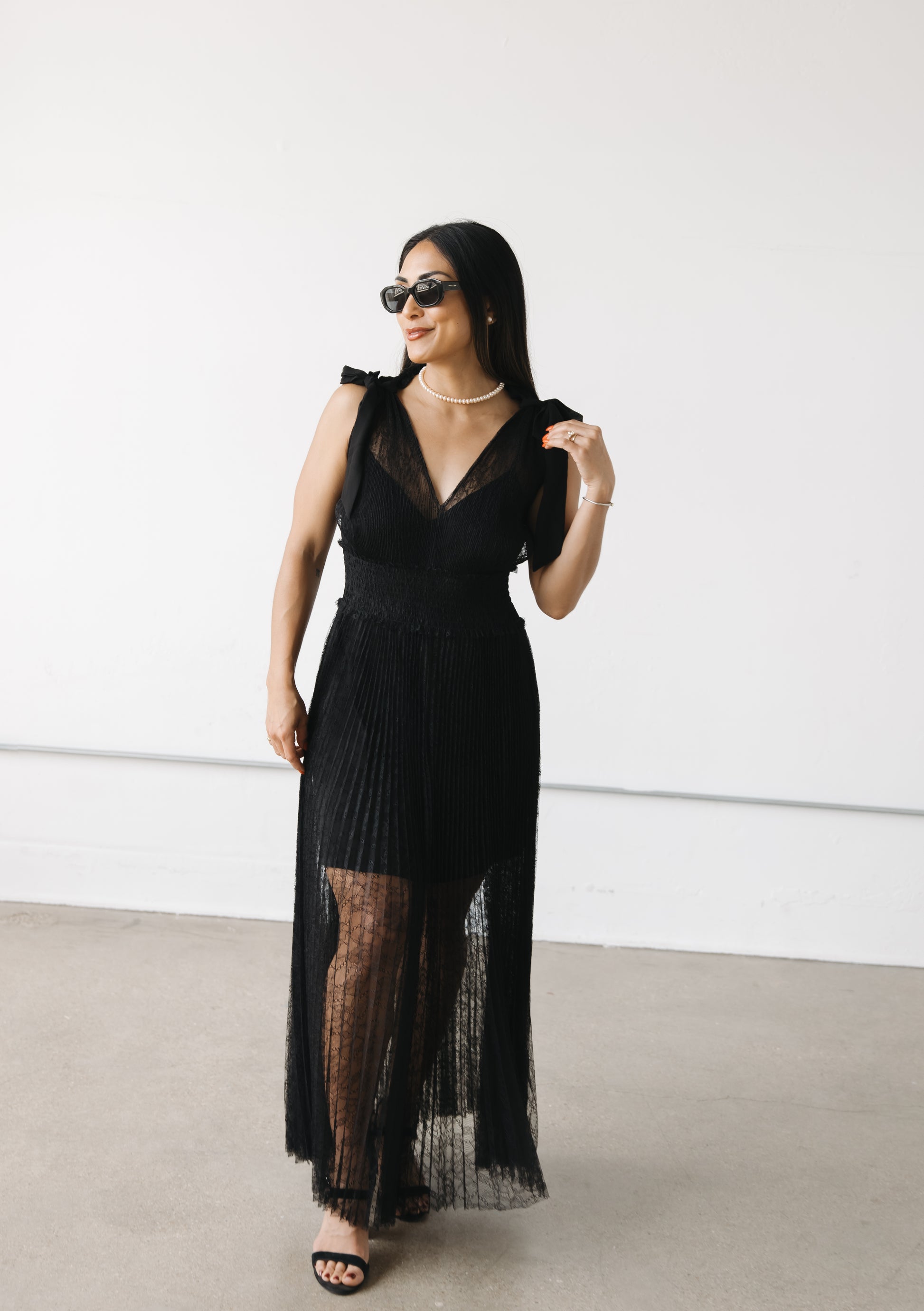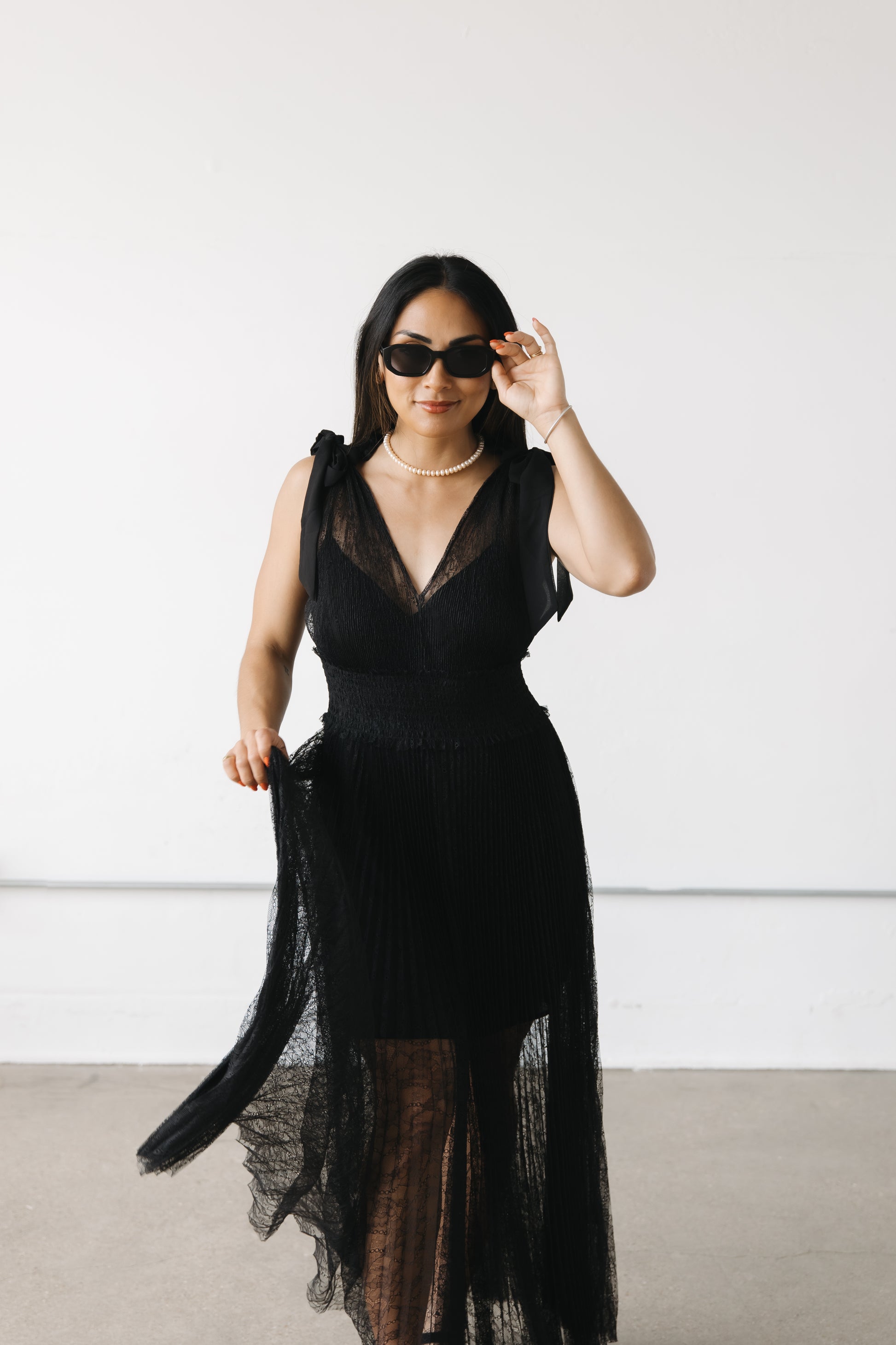 Be the belle of the ball (or wedding) in our Chandler Dress! This black dress features a delicate lace overlay, shoulder tie bows, & pleated skirt detail making it perfect for any formal event. Includes a slip dress for added coverage. A must-have for any wedding guest (or fashionista)!