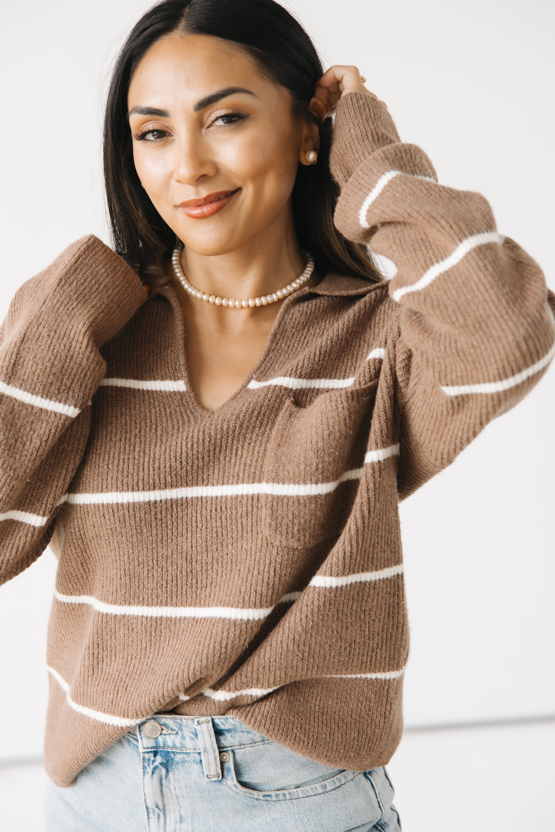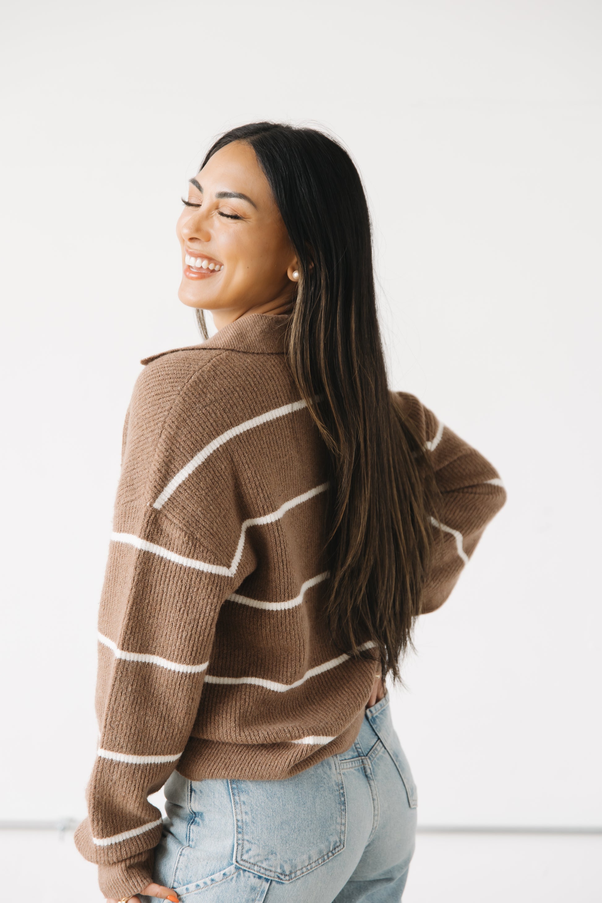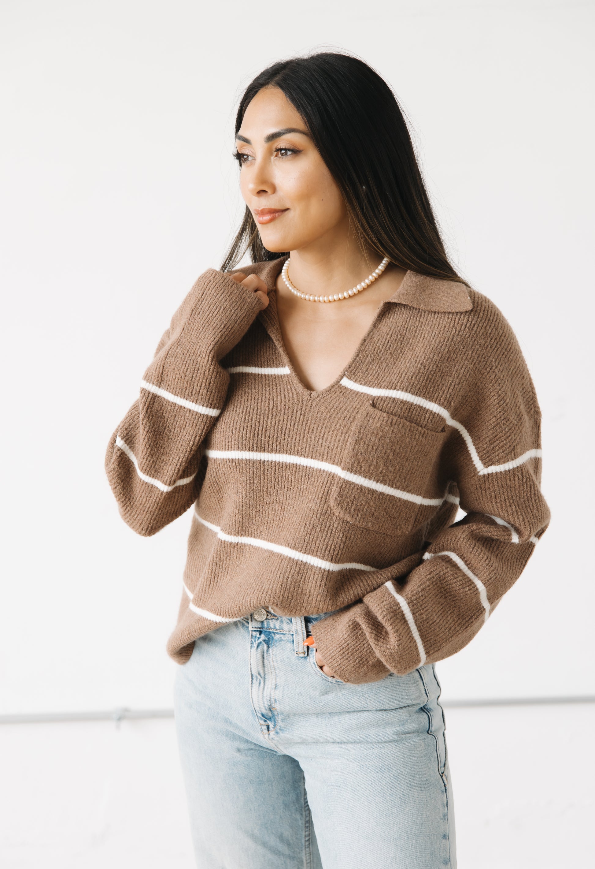 Spice up your winter wardrobe with our Elsa Sweater! This knit cinnamon brown sweater features cream colored stripes for a cozy but stylish look. Stay warm and on-trend this season in this playful and quirky addition to your closet. (Sweater weather never looked so good!)
