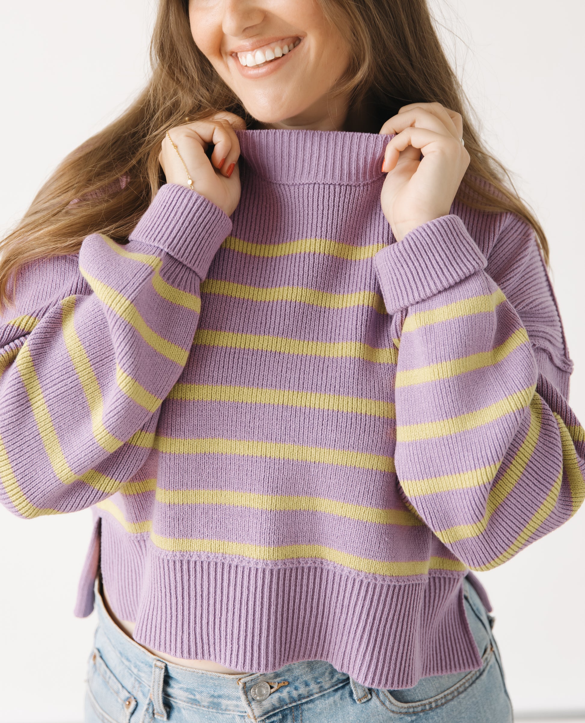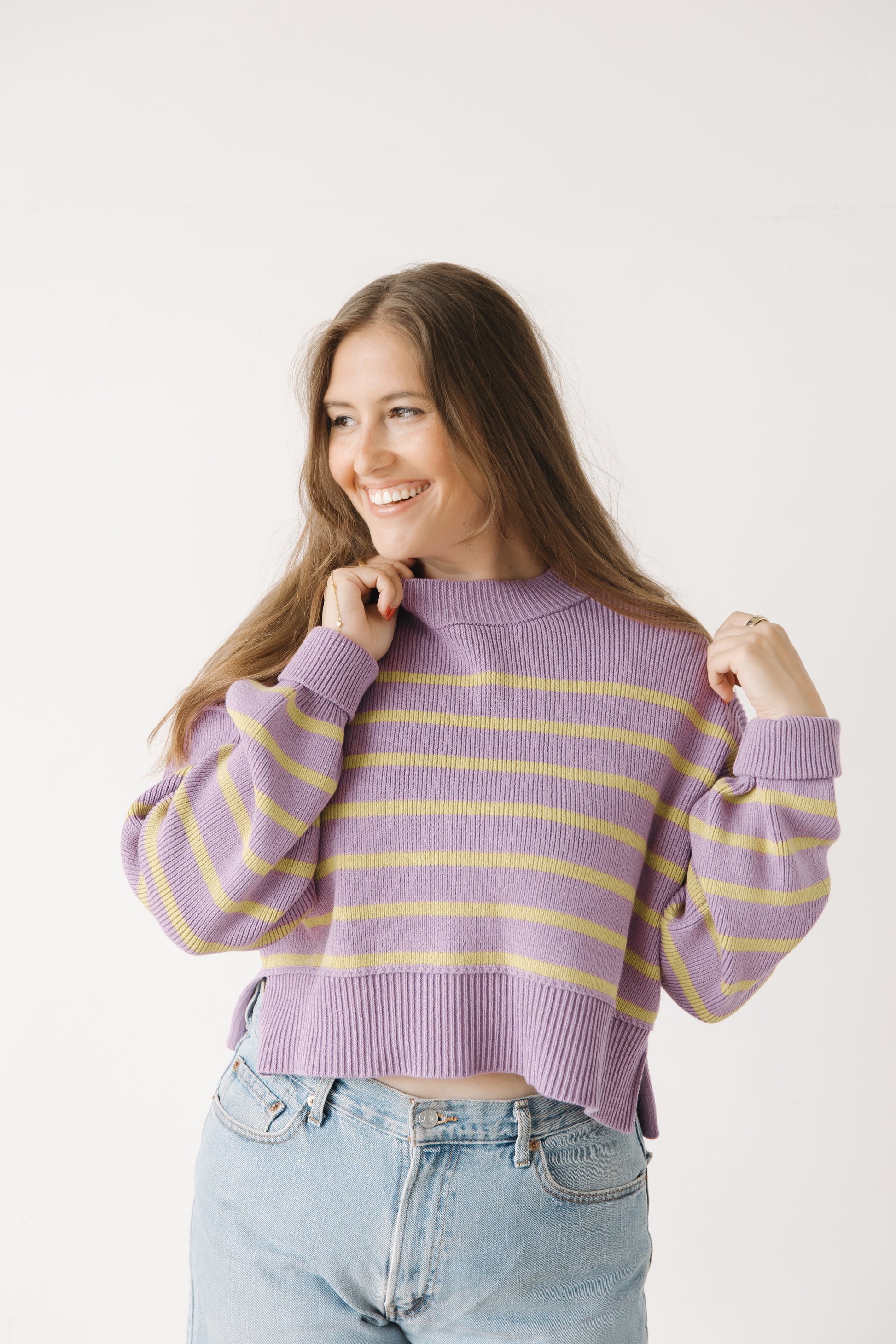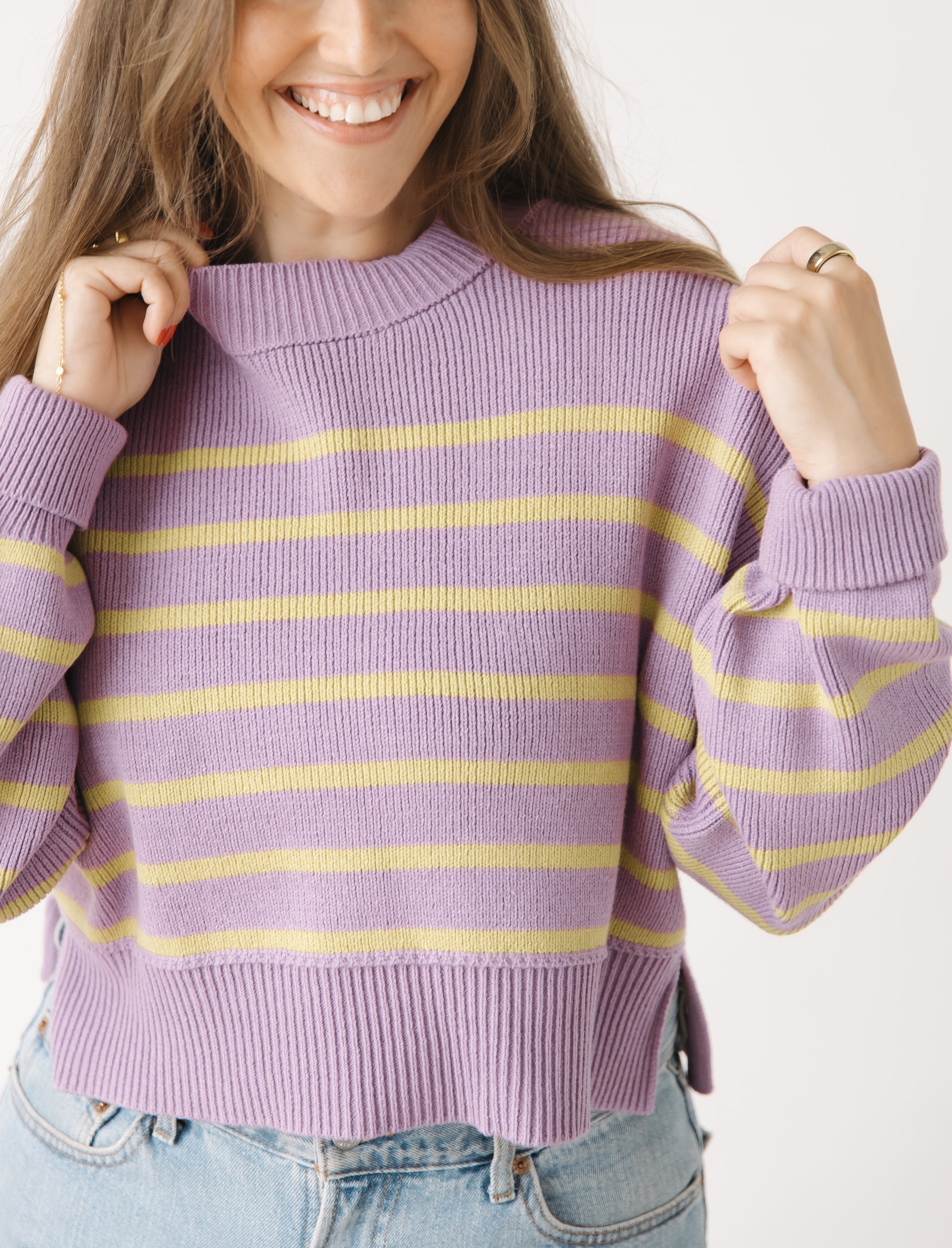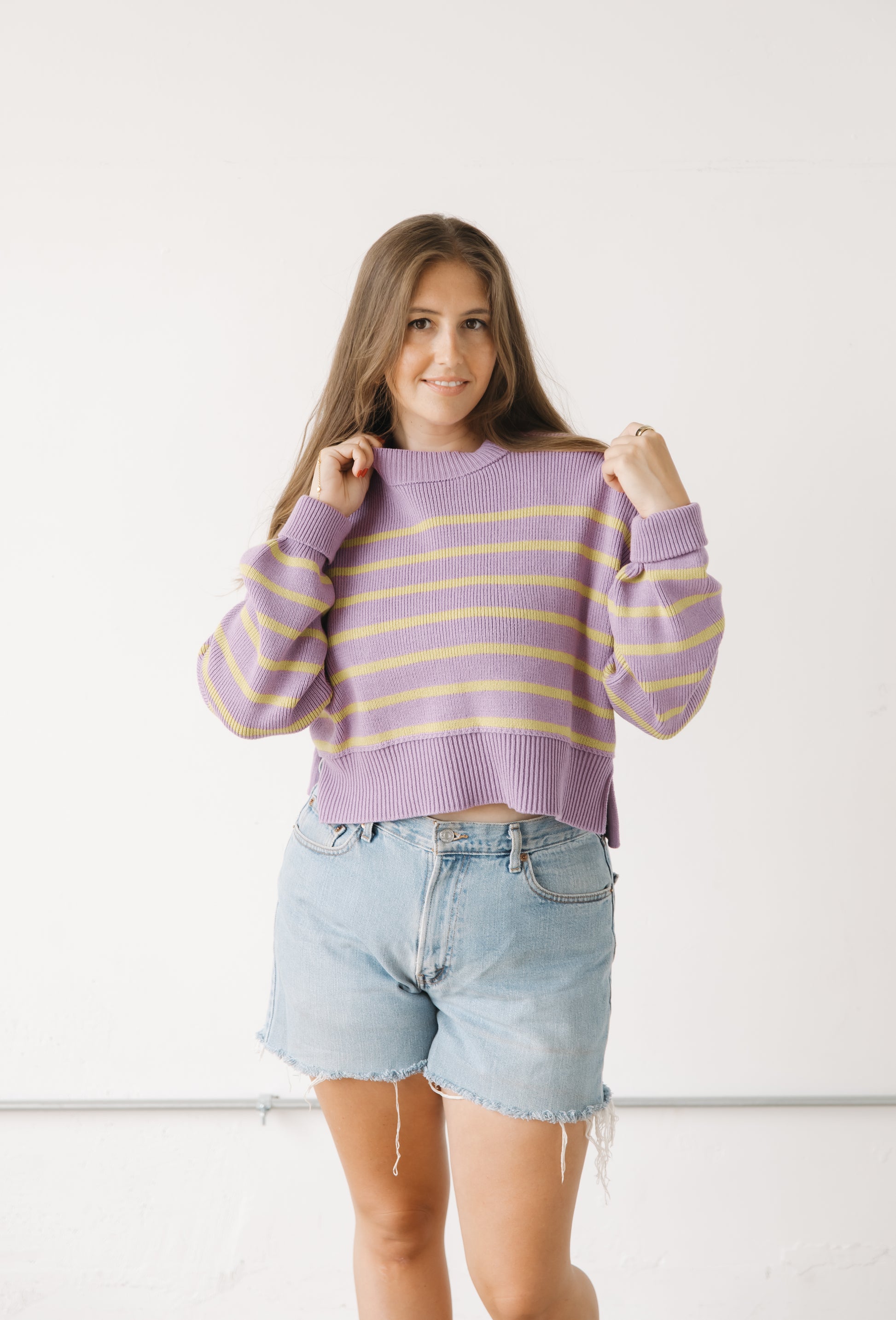 This bright lavender sweater, featuring green stripes, is not your average top. With a cropped length, slouchy fit and a fun pop of color, it's a perfect dupe for Free People's Easy Street Stripe Crop Pullover. Stay on trend and brighten up any outfit with the Kylie Sweater!