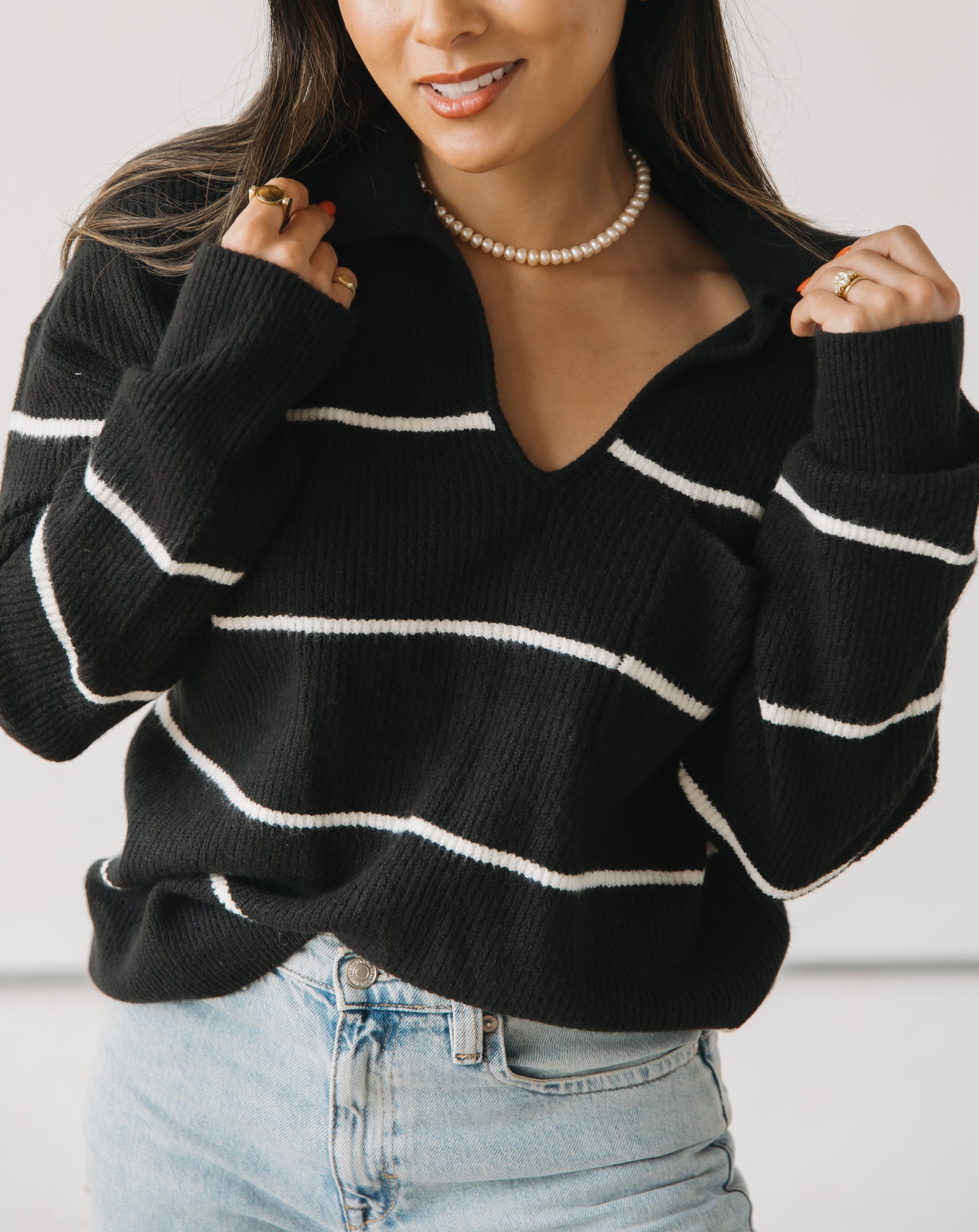 Spice up your winter wardrobe with our Penny Sweater! This knit black sweater features cream colored stripes for a cozy but stylish look. Stay warm and on-trend this season in this playful and quirky addition to your closet. (Sweater weather never looked so good!)